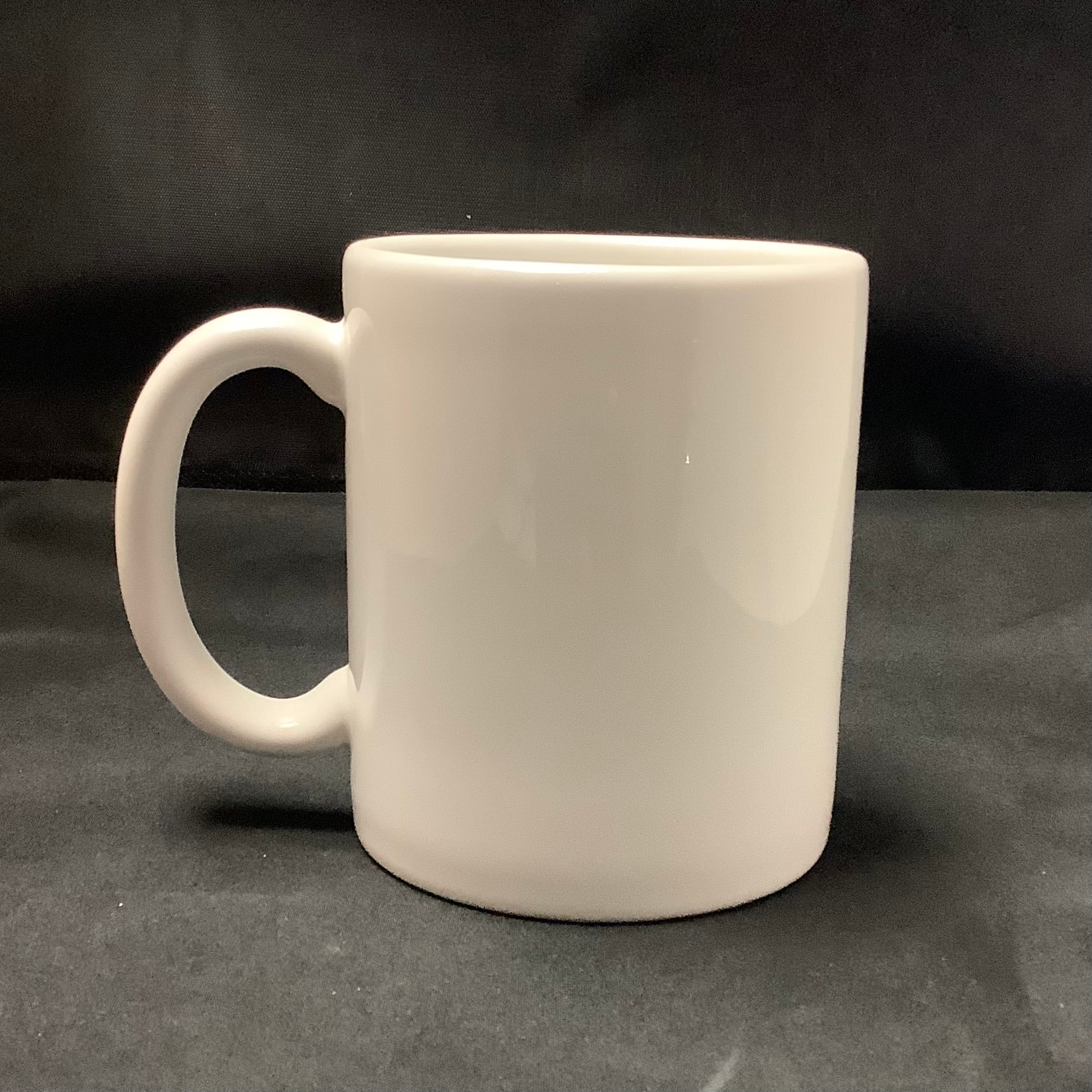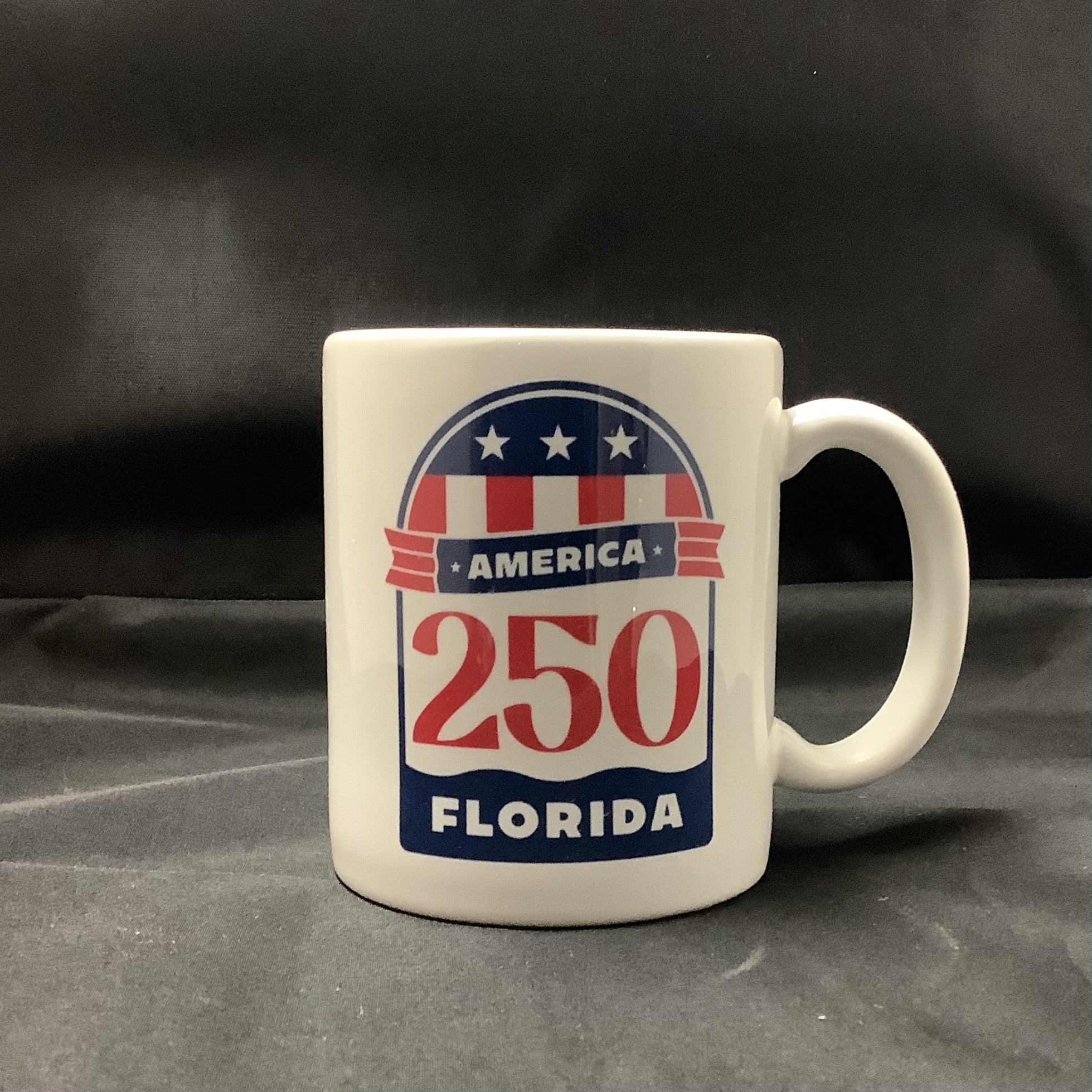 USA made 11 ounce white ceramic mug with America250FL logo imprinted on the front of the mug.
